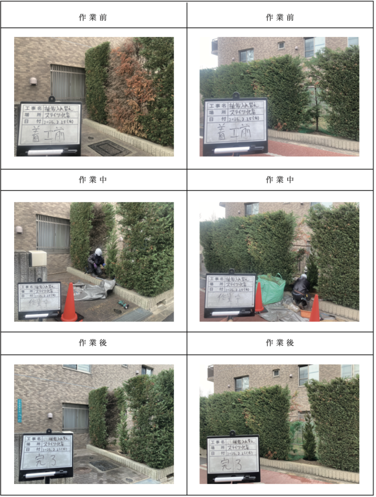 今回の施工により、枯れ木が解消され、マンション全体の美観が向上。居住者様にとって、より快適で心地よい共用空間となればと思います。