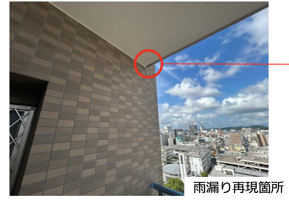 岡山県・後楽園の分譲マンションの漏水調査を実施。本物件は大規模修繕工事を実施した後にも共用部(開放廊下天井)への漏水が止まらず、大規模修繕工事の瑕疵の有無も判断したい事例でした。